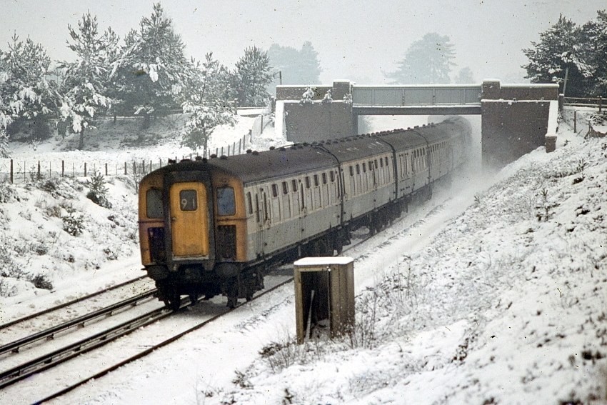 4TC No. 421 on a "fast" Bournemouth and Weymouth service once again, but a decidedly wintry scene. The train is depicted just under ½-mile south of Beaulieu Road station. The bridge carries a narrow farm track. © David Glasspool Collection