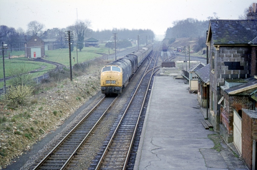 A now classic scene typical of that era which immediately followed the line's singling and degraded status as a secondary route. A "Warship" diesel-hydraulic is seen London-bound from Exeter, with what appears to be an ex-SR baggage car and rake of BR Mk 1 carriages in tow. These diesels were popular with enthusiasts, but based on contemporary articles written in the "Railway Correspondence & Travel Society's" journals, they were plagued by unreliability on Waterloo to Exeter workings, and eventually fell foul to the Western Region's policy of standardising on diesel-electric traction. The track upon which the train is seen was the only section of line which remained operational for BR services; the adjacent track, on the right, was used by the MOD for movements between Chilmark and Baverstock Depots. At that time, the "up" side goods yard more or less retained the full complement of sidings it had prior to the withdrawal of public freight traffic. The former "down" platform was no more than a mound of earth and rubble by this stage. On the left is RAF Dinton; both standard and narrow gauge tracks are in evidence. © David Glasspool Collection
