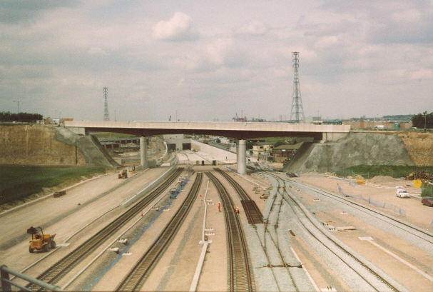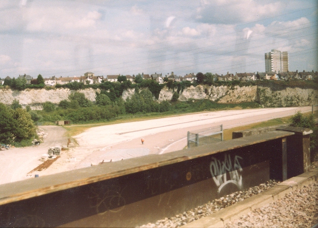 As aforementioned, a line linking the former South Eastern Railway's North Kent route with the new Channel Tunnel lines has been constructed. The single-track line spurs off the up North Kent Line, therefore only trains which have originated from the Gravesend direction can use it. The line at ground level on the right-hand side is a spur which leads to some sidings, now known as 'Church Path Pit Sidings'. The single-track line to the sidings also leads to another connecting spur with the down North Kent Line. © David Glasspool
