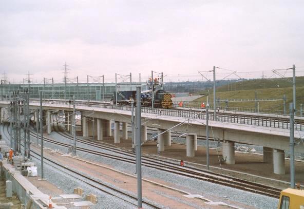 The station approaches are observed. The station building here is to the same basic design as that at Stratford International. On the elevated domestic line is a visitor to the area: Class 14 Shunter No. 14029. Between 1988 and 2000 inclusive, this locomotive was on the Nene Valley Railway, but since, it has appeared on Channel Tunnel contract work. It currently wears the all-over BR Blue guise. © David Glasspool