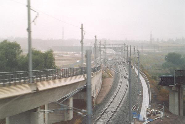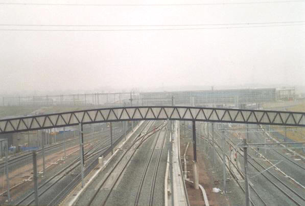 Could the supposedly Summer's day have become any murkier? The glass-clad structure on the right is clearly the main international station. Those overhead wire gantries lining up on the left mark the position of the elevated platforms and spur, the latter of which is also in the immediate foreground. © David Glasspool