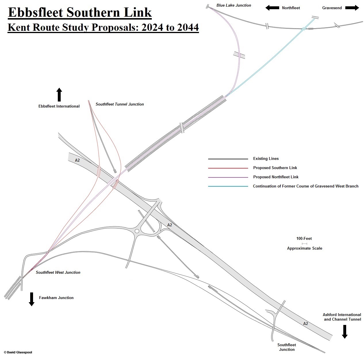 Option 3 has been the most interesting to ponder. On the northern side of the A2 still exists ¾-mile of double-track capacity railway cutting of the 1886 line to Gravesend, which has escaped redevelopment. Perhaps the plan here is to re-use this cutting for a link to the North Kent Line, a London-facing connection with the latter being made east of Northfleet (marked on the diagram as "Blue Lake Junction").