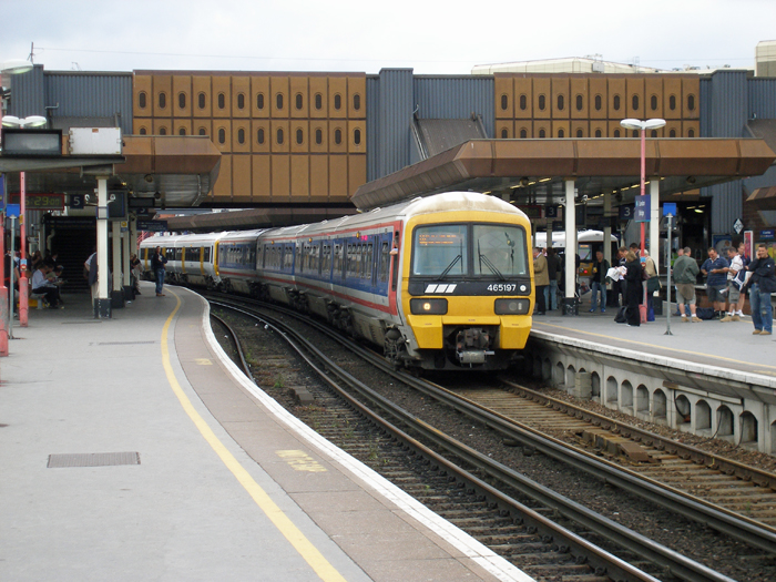 The windowless footbridge seen here had replaced a pair of lattice footbridges in the late 1970s. It stretched from the ex-South Eastern Railway offices in the north (albeit not accessible to the public) to platform Nos. 13 and 14 within the terminus' trainshed. Class 465 No. 465197, wearing Network SouthEast livery, but with more recent black window frames and buffer cowlings, is seen forming the "52" service to Gravesend via Sidcup with a Class 466. © David Glasspool
