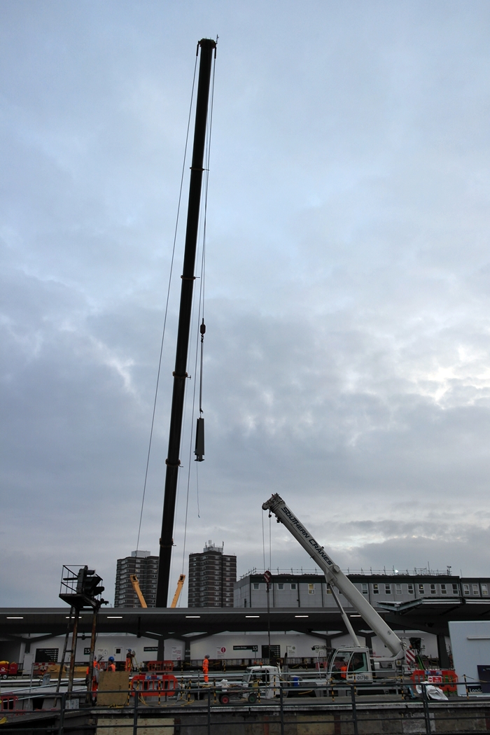 A huge crane, on hire from ''Ainscough'', is seen lowering one of the supports for the new canopy being constructed for platform Nos. 11 and 12. © David Glasspool