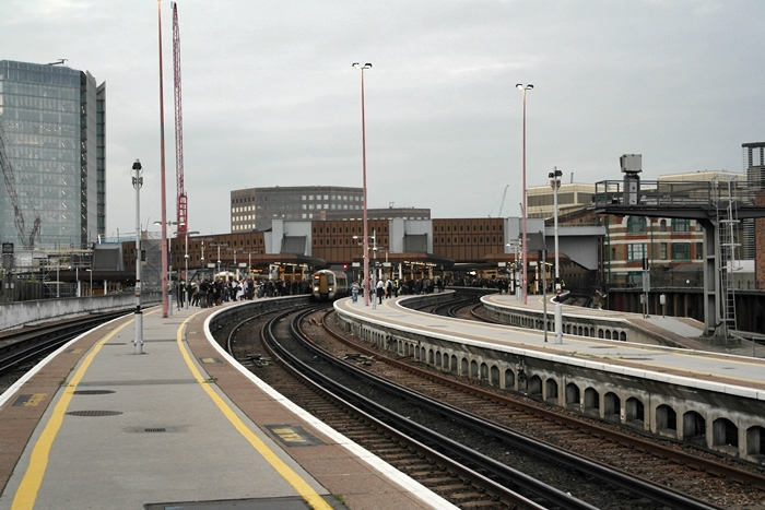 There remained a decent crowd on the ''through'' platforms at 19:21, nearing the end of the evening rush hour. However, it was noticeably quieter without those services which used the adjacent terminal platforms, not to mention the absence of ''Thameslink'' trains. On the right, we can see the footbridge's physical connection with the ex-SER offices in Tooley Street. © David Glasspool