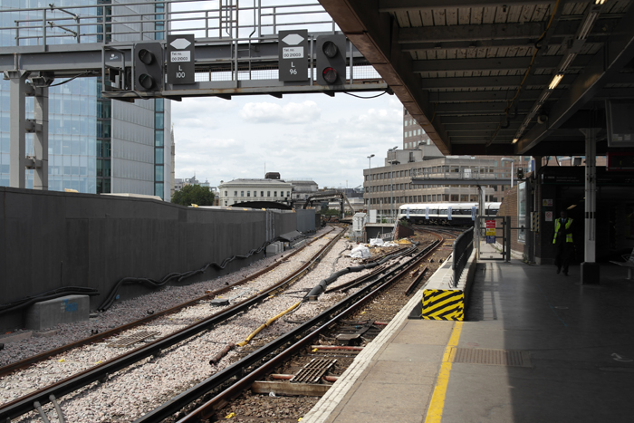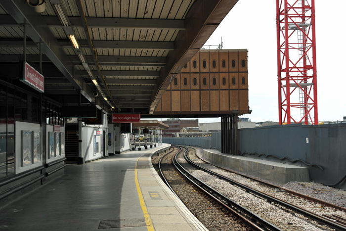 The dark grey barricade on the left-hand side of this westward view hides new platform construction on the former site of the demolished island. Rebuilding of the remaining northern side of the "high-level" station, encompassing the two islands formed of platform Nos. 1 to 4, is scheduled to commence in August 2016. © David Glasspool