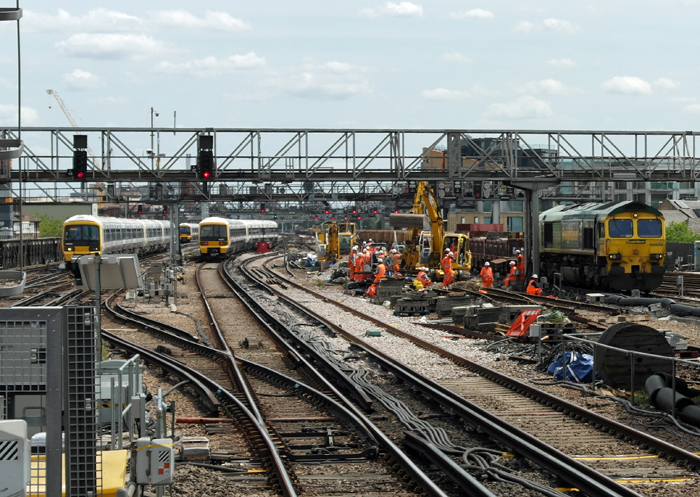 The eastern approaches to London Bridge have become home to top-and-tailing Class 66 formations, which are now a familiar feature of the commuting landscape. There were two such trains in evidence on this day, both powered by Freightliner Class 66 diesel-electrics. The locomotive nearest the camera is No. 66522, alongside a sea of orange high-visibility vests as work progresses on re-arranging the station's throat. © David Glasspool
