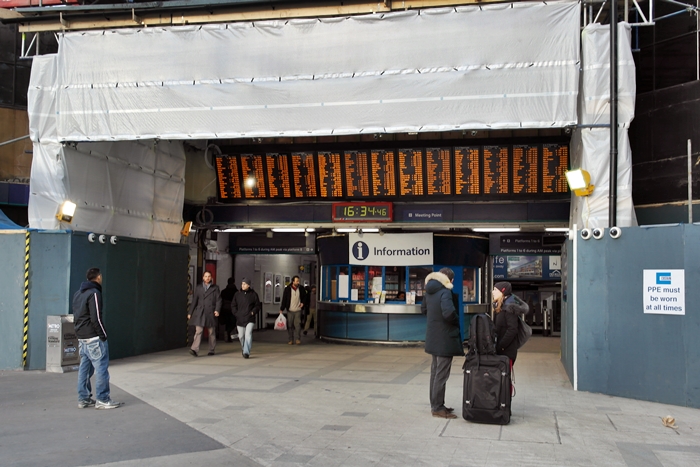 A northward view shows a light and airy concourse, with the ticket barriers to the terminal platforms being on the right. In the background can still be seen the framework of the previous building. © David Glasspool