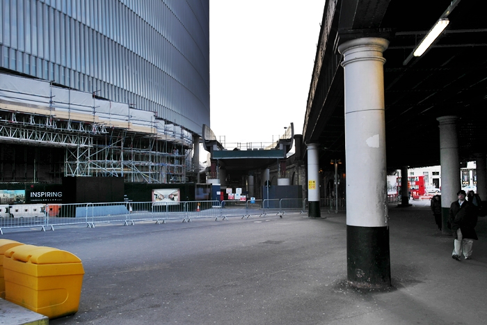 A westward view shows the end of the new viaduct tightly sandwiched in-between the existing Charing Cross lines and the ''Baby Shard''. © David Glasspool