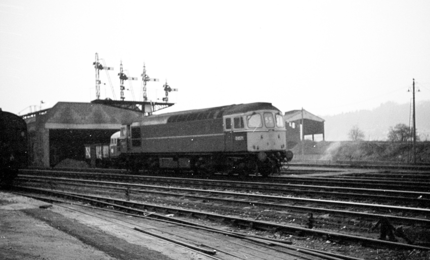 As late as 1970, the engine shed was still standing, by that time being used as a stabling point for “Type 3” (later “Class 33”) diesels. Even the elevated coal stage, complete with canopy, was still in evidence. In view is Type 3 No. D6571, which was not on one of the shed roads, but instead approaching Redhill upon one of the tracks forming the Tonbridge line. This locomotive was later renumbered to 33053 and has made it into preservation. © David Glasspool Collection