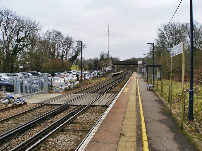 A southward view from the "up" platform shows that a barrow crossing has returned in some form, if only for use in the engineering capacity. On the right are the two waiting shelters added in 1985, whilst in the background is the somewhat clinical footbridge. As the car park suggests, this station handles a significant commuter traffic. © David Glasspool