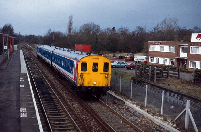 No. 205018 is seen entering the staggered platform layout at Edenbridge, forming a Reading to Tonbridge service.