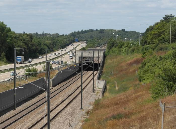 A north westerly view shows that the tunnel is tightly sandwiched in-between the embankment (above which is the A20) and the M20. The next tunnel in the London direction is that of Hollingbourne, 3¼-KM (2 miles) distant. © David Glasspool