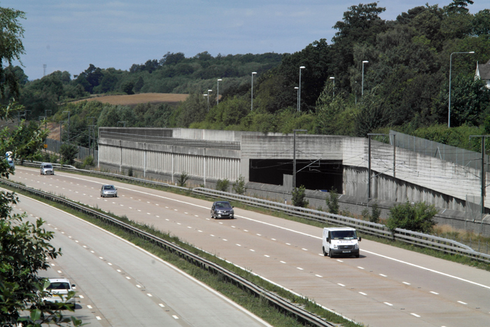 This is a peculiar structure, located on Section 1 of the CTRL (now High Speed 1) 19-KM (11.8-miles) north west of Ashford, immediately adjacent to the M20. It resides on that part of the line which formed Contract 420, from Boxley (about 4.8-KM/3-miles northeast of central Maidstone) to Lenham Heath, which was worth £140,000,000 and awarded jointly to ''Hochtief'' and ''Norwest Holst'' in March 1999. Defined strictly as a "cut-and-cover" tunnel, this is a rectangular concrete structure which extends over the double-track line for 150-metres (164-yards).