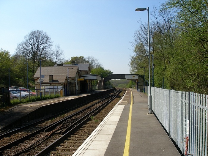 A westward view reveals that the station structures had been nicely cleaned since the picture from 1980. In the background is the 1961-installed prefabricated concrete footbridge, whilst in the foreground, to the right, is palisade fencing which marks the beginning of the platform extension. The dock line formerly terminated behind the section of the "up" platform seen on the left, the near side of the station building. This area has now become an extension of the car park. © David Glasspool