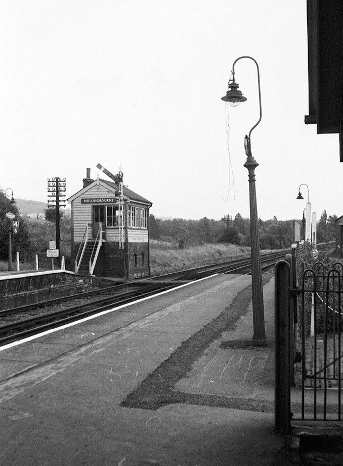 The station changed little under the Southern Railway, save for the addition of swan-neck gas lamps. The advent of the Kent Coast Electrification appeared to bring the greatest of change to most sites along the route. The first scheduled electric services commenced along the line on 9th October 1961, to existing steam timings. This had been preceded on 15th May of the same year by the closure of the goods yard at Hollingbourne, and the installation of a prefabricated concrete footbridge immediately west of the platform structures. Maidstone East’s layout was re-signalled with three-aspect colour lights during 1962, and on 8th April of that year, a new power box came into use at the site. This was followed by the commencement of the accelerated electric timetable on 18th June. Nevertheless, the rest of the line retained semaphore signals, and an Absolute Block System existed between Maidstone and Hollingbourne. This used Sykes Lock and Block instruments and allowed Bearsted signal box to be switched out of use. This remained the situation until 1984: on 14th April of that year, the Maidstone East Panel took control of the route between Kemsing and Hothfield inclusive, which resulted in the closure of the Saxby & Farmer signal cabins along the route (except for that at Hothfield, which remained until 16th February 1985 to control a siding). Semaphore signals were replaced at this time with three-aspect colour lights.