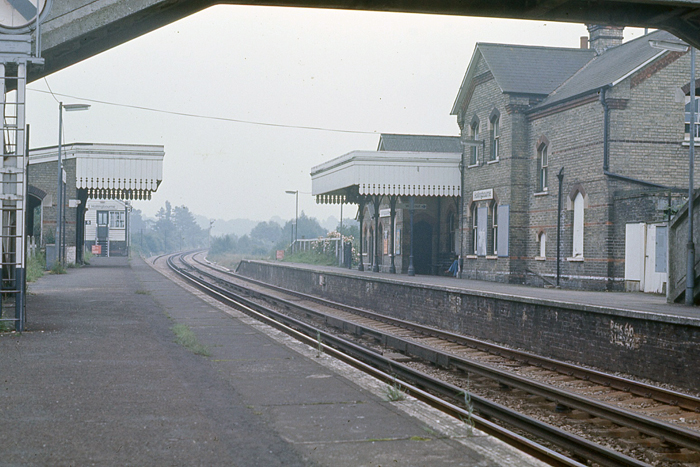SR Swan Neck gas lamps are in evidence in this eastward view of the Saxby & Farmer signal box, which remained in use until 14th April 1984. BR "Totems" are on the lampposts, and a barrow crossing remained at the ends of the platforms at this time. The goods shed can just be picked out on the extreme right. © David Glasspool Collection