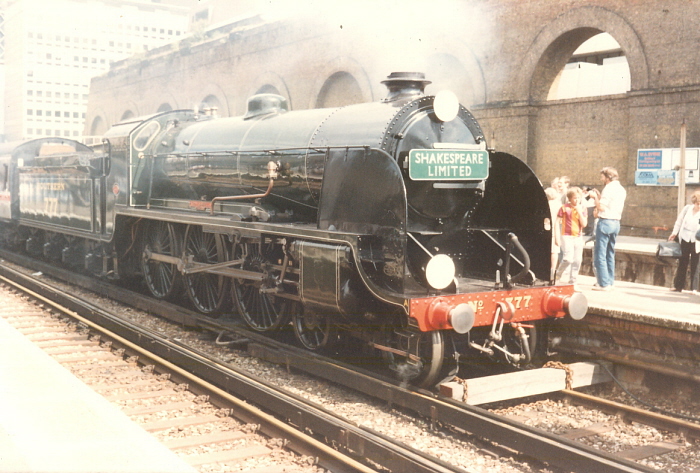 King Arthur Class No. 777 ''Sir Lamiel'' was once a regular Eastern Section performer, and it was star of the show at the Cannon Street Exhibition. Behind the locomotive can be seen the eastern wall, looking in a sorry state, with grass emerging from the top, and brick infilling the arched window frames. Significant truncating of the walls at their northern ends was necessary to incorporate the office blocks during the rebuilding. © Mike Glasspool