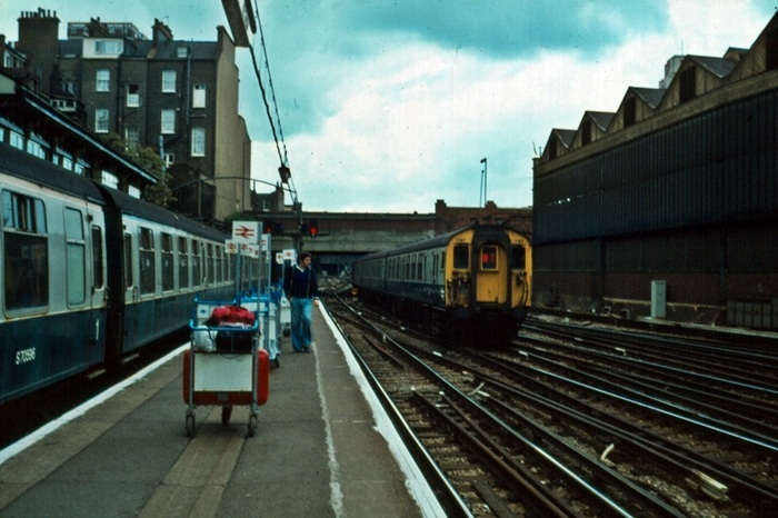 British Rail luggage trolleys abound on platform Nos. 1 and 2, as 4 CEP No. 7197 disappears underneath