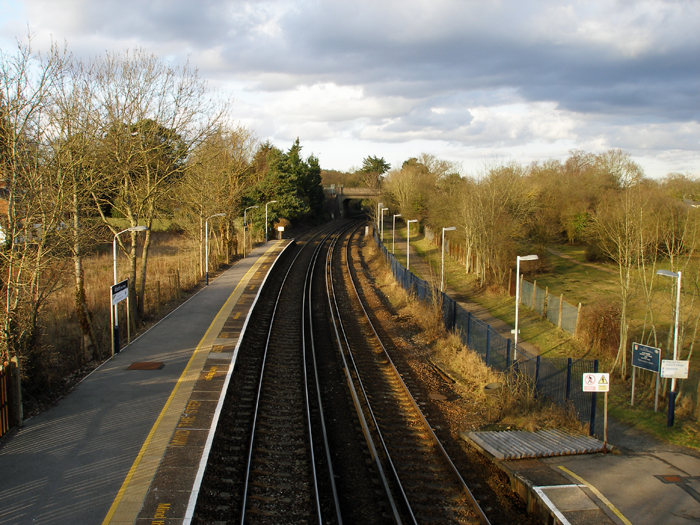 A northward view from the footbridge shows, in the distance, the road bridge which replaced the level crossing in 1932. The running lines were once flanked on both sides by sidings.© David Glasspool