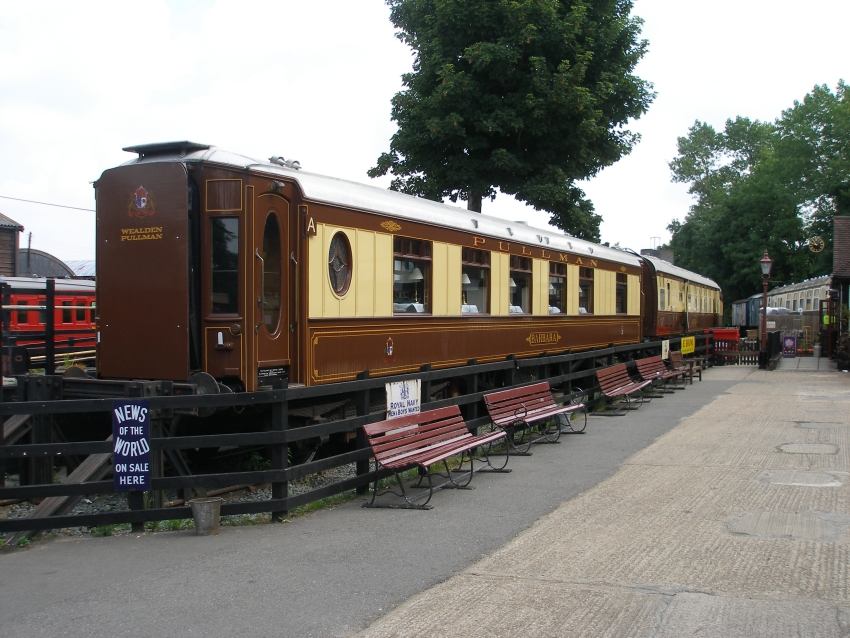 Splendidly restored Pullman car "Barbara" is seen stabled at Tenterden Town station, complete with the distinctive "matchbox" finish and "Wealden Pullman" gangway plate. © David Glasspool