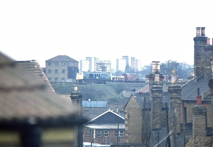 Taken from the photographer's back window, an E5000 series (later Class 71) electric locomotive is seen fronting an assorted freight of vans and open wagons. The train is at milepost 32¾ from Victoria, on the northern approaches to the Medway railway bridge and the former Rochester Bridge station. The viaduct of Rochester Bridge station at one time diverged from today's "Chatham" route 250-yards beyond the front of the locomotive, but had been demolished two years prior to this photograph. © Roger Goodrum