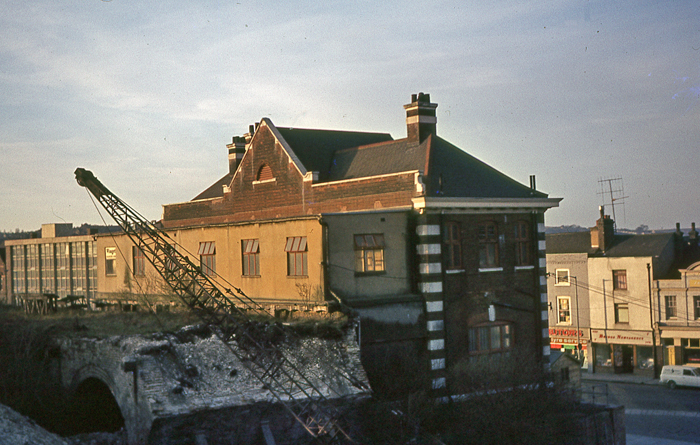 A sad sight indeed: the demolition of Rochester Bridge station. The substantial red brick main building of 1908 is in view, showing its stone-lined edges and hipped roof arrangement. The single-storey concrete structure was added long after closure, in about the 1940s, and sits upon the former "up" platform. To the bottom left, destruction of the viaduct is in full swing and today, not a brick remains. © David Glasspool Collection