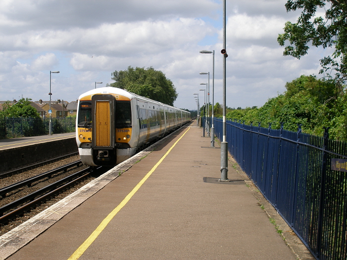 Three-car Class 375 No. 375301 passes through Teynham with a Faversham service, with portions for Ramsgate and Dover. The railings on both platforms are relics from the LC&DR era, and the overgrown area on the right, behind the platform, was formerly host to both a Standard Gauge and Narrow Gauge siding. © David Glasspool