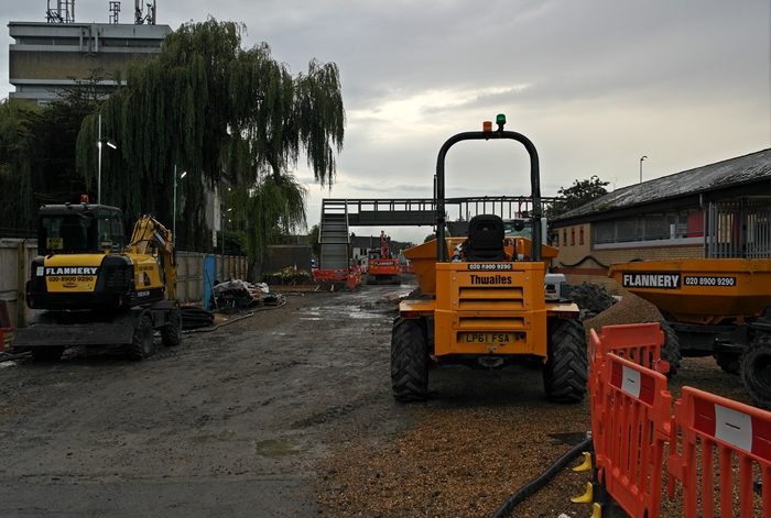 The footbridge is up, but still much work to do. An additional track is due to be laid on the right-hand side, behind the present platform 1. Original diagrams show the booking office of the temporary station to be elevated on stilts around the staircase seen in the above view. © David Glasspool