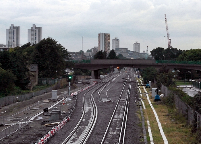 This view at the eastern end of the station, under Harrow Manor Way, shows the site where the four lines will narrow to double-track. A short distance beyond the trees on the left can be found the main construction site offices, which occupy a former car park. © David Glasspool