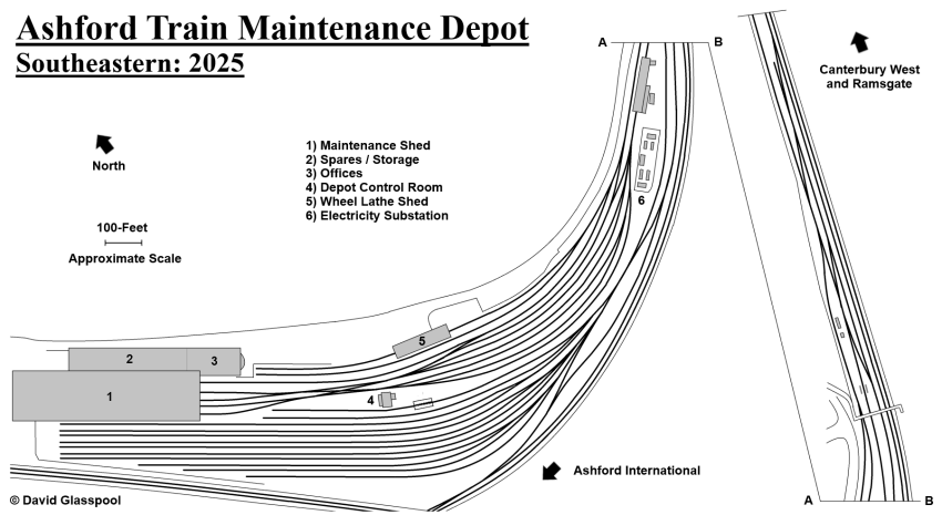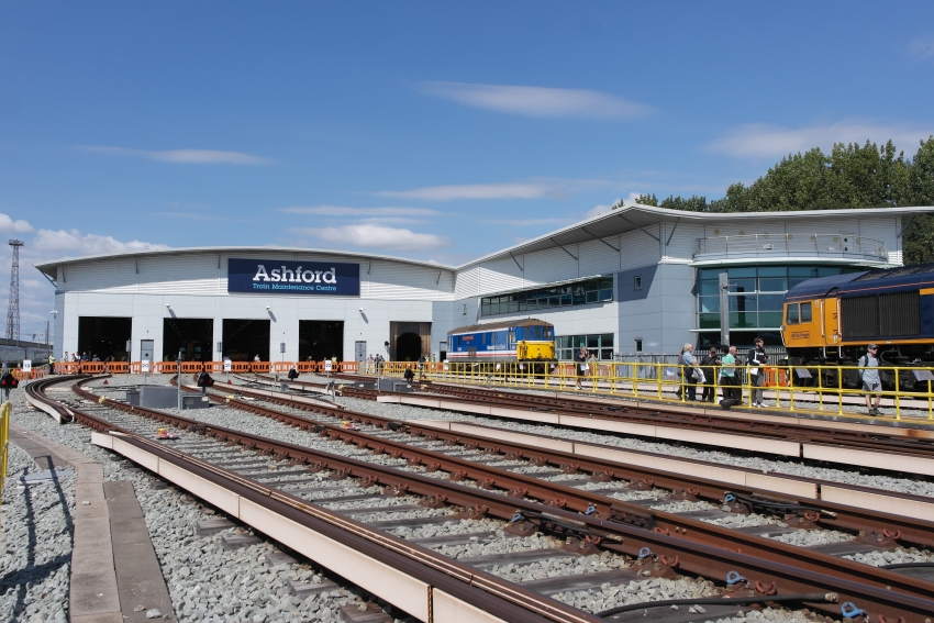 The depot shed comprises five dead-end tracks, the approaches of which are electrified by third rail to just short of the building’s entrance. Originally, the facade here proclaimed "HITACHI Inspire the Next", but some time between 2019 and 2022, this was replaced by the "Ashford Train Maintenance Centre" sign seen here. © David Glasspool