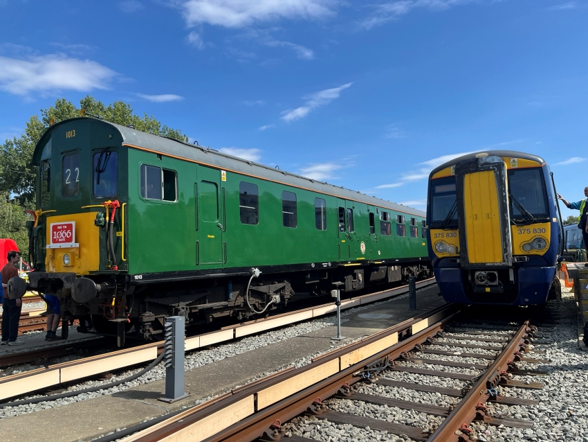 No. 1013 was one of two six-car "Hastings" diesel electric multiple units — the other being No. 1001 — purchased from British Rail on 10th March 1989 by "Hastings Diesel Preservation Limited" (later to become "Hastings Diesels Limited"), the organisation having been formed in February 1987 (ref: The Railway Magazine, February 1992). Both units live at St Leonards Depot in East Sussex, where the preservation group leases space. The first scheduled twelve-car DEMU trains on the Hastings line via Tunbridge Wells commenced on 6th May 1957 (ref: RCTS’ The Railway Observer, June 1957); full electric timings on that route commenced on 12th May 1986 (ref: The Railway Magazine, July 1986). As for No. 375830, this unit was named "City of London" at Cannon Street on 21st December 2004, to mark completion of the 112th and final Class 375 Electrostar for what was then called "South East Trains" (ref: The Railway Magazine, March 2005). The unit was returned to Ramsgate from Derby Litchchurch Lane after refurbishment and having an all-over blue colour scheme applied, on 10th March 2008 (ref: The Railway Magazine, May 2018). © David Glasspool