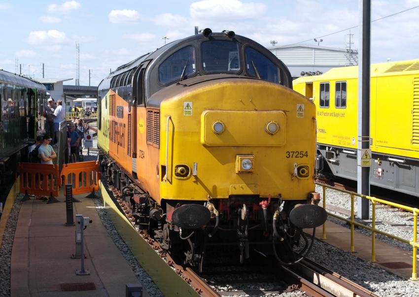Class 37 No. 37254, seen here wearing Colas Rail’s yellow, orange, and black livery, was one of eight Class 37 diesels put up for sale by "Harry Needle Railroad Company" in early 2003, on the condition that buyers were from the heritage sector and not commercial main line operators (ref: The Railway Magazine, May 2003). The locomotive ended up on a site in Sellinge, Kent, where it was restored, and was subsequently transferred by road to the Spa Valley Railway on 27th March 2008 (ref: The Railway Magazine, June 2008). In 2015, No. 37254 was purchased by "Colas Rail" and left the Spa Valley Railway to be returned to main line use (ref: The Railway Magazine, October 2015). © David Glasspool