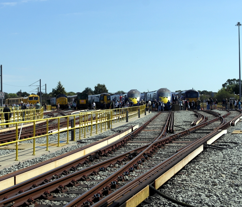 An eastward view captures a rolling stock line-up. From left to right: Robel "Mobile Maintenance Systems" (MMS) set (led by power car No. DR97502); Colas Class 37 No. 37254; "Hastings" unit No. 1013; Class 375 No. 375830; a pair of Class 395 "Javelins", and "Citybeam" Class 707 No. 707013. © David Glasspool