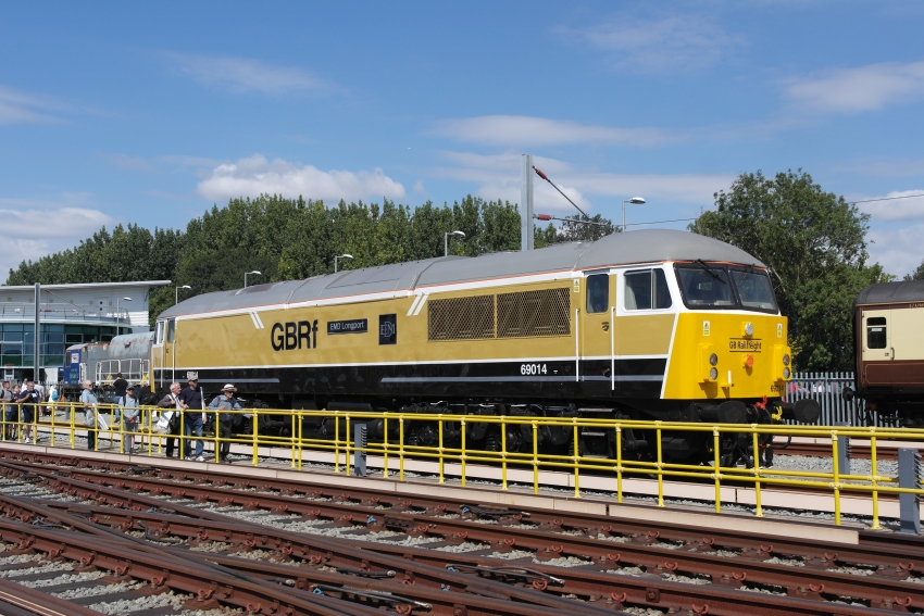 Class 69 No. 69014 was formerly Class 56 No. 56104, the locomotive being renumbered in 2024 (ref: The Railway Magazine, January 2025). The conversion from Class 56 to 69 involved replacing the original 3,200 HP Ruston Paxman diesel engine with an Electro-Motive Diesel (EMD) engine of the same power rating. This engine is the same as that used in the Class 66; the Class 69 is also equipped with the same traction control and cooler systems as the former. On 19th March 2025, No. 69014 emerged from Arlington Paint Services, Eastleigh, in the colour scheme seen above, which is based on that of one-off 4,000 HP Hawker Siddeley Diesel-Electric No. HS4000 "Kestrel". The latter was a prototype that was formally handed over to British Rail at Marylebone station on 29th January 1968, but surprisingly exported to Russia in summer 1971 (ref: The Railway Magazine, October 1997). No. 69014 was named "EMD Longport" on 26th March 2025 at Longport, Stoke-on-Trent, Staffordshire (ref: RCTS’ The Railway Observer, May 2025). © David Glasspool