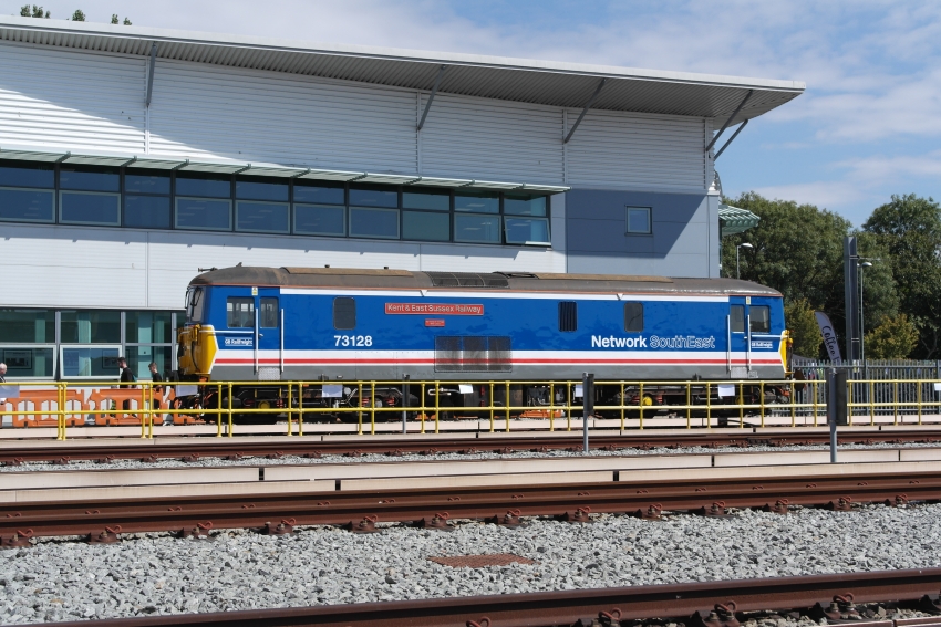 Looking resplendent in Network SouthEast "toothpaste" livery was Electro-Diesel No. 73128 "Kent & East Sussex Railway". Belonging to Great Britain Railfreight (GBRf), No. 73128 was previously named "O.V.S. Bulleid C.B.E." and wore the company’s orange and dark blue scheme; it received its present name on 31st May 2024 (ref: RCTS’ The Railway Observer, July 2024). The locomotive wears a second plate on each side proclaiming "50 Years of Heritage 1974 - 2024". © David Glasspool