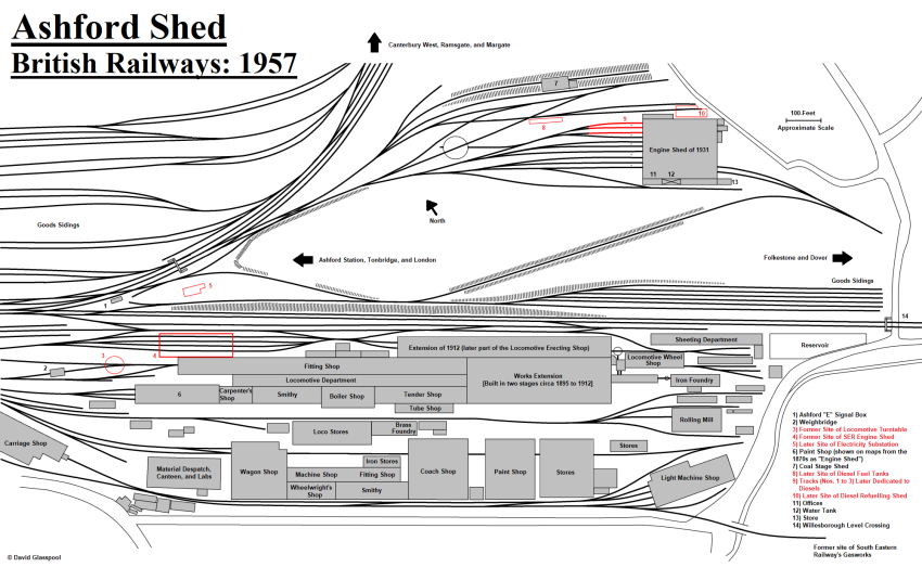 The shed mentioned above was made from the same yellow brick as that which can still be viewed today within the surviving works buildings. Period Ordnance Survey maps of various scales from the 1870s in fact mark two buildings west of the works complex as "engine sheds"; in addition to that described above, a second structure covering three London-facing dead-end tracks, 80-feet to the south, was present. Your author accepts that building descriptions on Ordnance Survey maps are not always accurate, and on much later editions the second building mentioned is marked "Paint Shop", which may have been its function all along. Indeed, as part of an interview with The Railway Magazine in September 1901, Harry S. Wainwright – Locomotive Superintendent of the SE&CR – stated that Ashford had a "paint shop and a large running shed as well as good accommodation for stores", suggesting that at least by that time, only one engine shed building existed. The diagram below indicates these buildings' positions in relation to each other and those of the rest of the works.