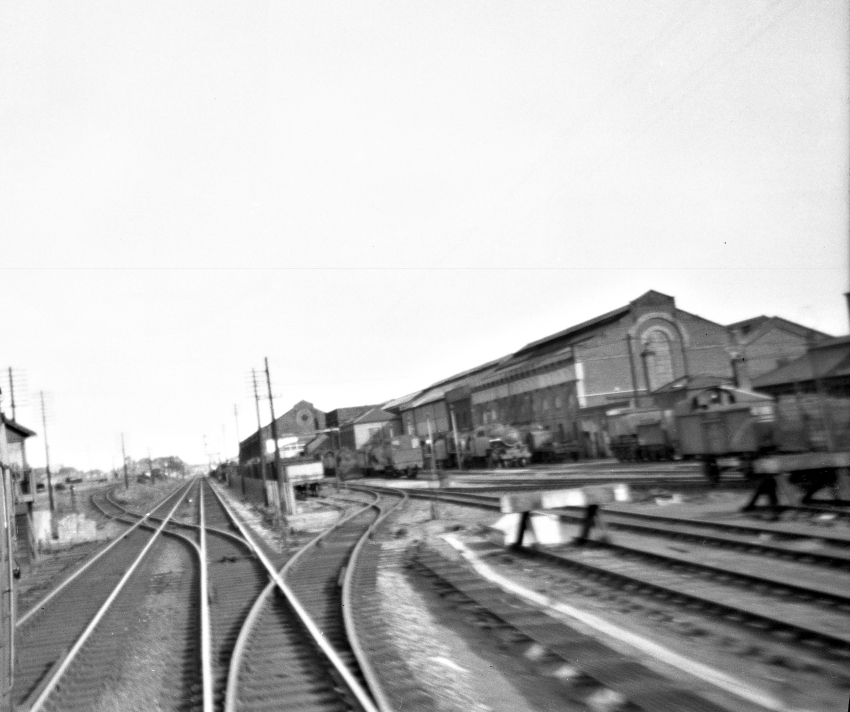 This south eastward view towards Folkestone was taken from a train coming off the Thanet branch via Canterbury West, and just about includes the edge of Ashford "E" Signal Box on the extreme left. Sandwiched in-between "E" Box and the double-track main line is an ascending single track which at that time led to six goods sidings, as shown on the above diagram. The goods sidings terminated near Willesborough Level Crossing, and the single track in view also provided an alternative route to the engine shed, which involved a reversal at its rear. On the right are the remaining structures of Ashford Works, which had ceased locomotive construction during World War II, but was still building wagons and repairing engines; the latter transferred to Eastleigh in 1962. The group of locomotives to the left of the main works buildings, which includes a Fairburn 2-6-4 Tank and an 0-6-0 diesel shunter (later Class 08), were upon those tracks which were once covered by the SER's engine shed. © David Glasspool Collection