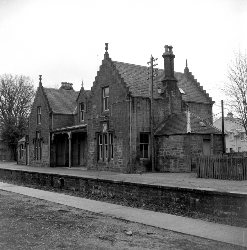 The grand former main building — of sandstone construction — shares the same architectural traits as the single-storey variant at Dingwall, which dates the structure to about 1887. This view from the Dingwall-bound platform was captured in about 1966, by which time the "up" loop had gone, as had the footbridge, but the "down" waiting room and North signal box remained standing. By summer 1973, fencing had been erected along the former "up" (Inverness-bound) platform. © David Glasspool Collection