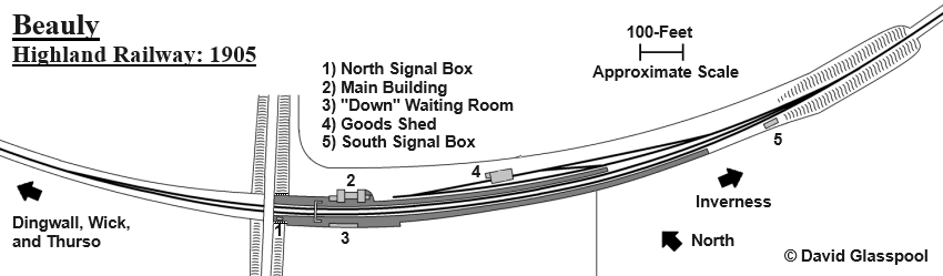 From your author’s perspective, it seems likely that signalling enhancements were made at Beauly around the time of station’s aforementioned rebuilding. The 1880s and 1890s was a time of intensive re-signalling nationwide, as independent railway companies replaced early equipment with much more advanced systems. Two signal boxes came into use: one was situated upon the north western extremity of the Dingwall-bound platform; the second was located adjacent to the points of the passing loop’s south eastern end. These became "Beauly North" and "Beauly South" signal boxes respectively, and their positions are marked on the diagram. The Scotland Register (Volume 6 Section V1: Inverness Station to Wick) of the Signalling Record Society suggests 1891 as the year the signal boxes at Beauly were commissioned.