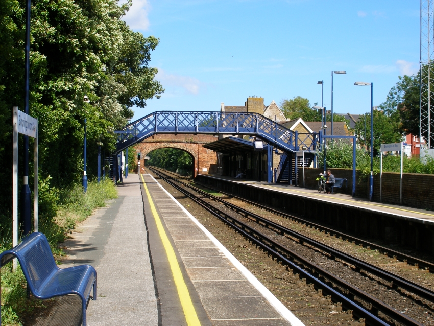 An eastward view from the ''down'' platform again shows the SE&CR lattice footbridge, but also clearly reveals the canopy of the ''up'' side, added to the main building in 1958 as part of the electrification works. © David Glasspool