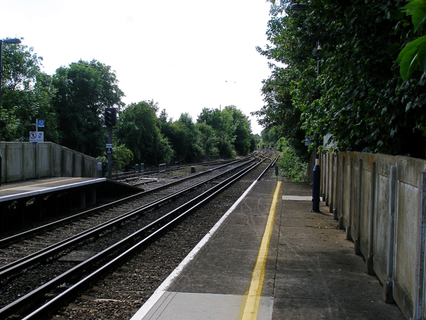 A westward view includes the 1958 prefabricated concrete platform extensions and a three-aspect colour light. Emerging on the left, from behind the ''up'' platform, is a single truncated section of a goods yard siding. © David Glasspool