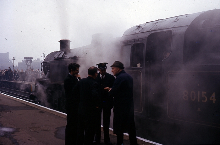 On 9th October 1966, Standard Tank No. 80154 was observed at London Bridge ''low-level'', fronting the ''Four Counties'' rail tour for the ''Southern Counties Touring Society''. The locomotive hauled the train to Wimbledon, where it was joined by USA Tank No. 30072, and the pair proceeded onto Tooting Junction goods yard. After returning to Wimbledon, both locomotives were replaced by Bulleid Light Pacific No. 34052 ''Lord Dowding'', which took the tour onto Salisbury via Guildford. © David Glasspool Collection