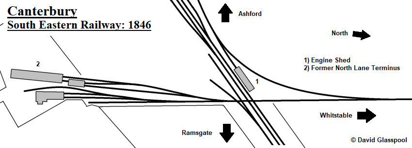 The South Eastern Railway (SER) opened a double-track line between Ashford and Canterbury to passenger traffic on 6th February 1846 and it is likely that the engine shed came into use at this time. From that day onwards the company also closed the Whitstable branch, which it had taken out on a fourteen-year lease, so it could be re-laid with double-headed rail upon new chairs and sleepers, converted wholly to locomotive haulage, and diverted from the original southern terminus at North Lane into the SER’s Canterbury station. Stationary steam engines were originally required, because such were the inclines on the route that a locomotive of the day would not have been able to surmount them. The former North Lane terminus of 1830 was transformed into a goods and coal yard, but retained a direct connection with the branch, and the line to Whitstable was reopened to traffic on 6th April 1846. On 13th of that month, an extension from Canterbury to Ramsgate was opened to public traffic, followed by another to Margate on 1st December.
