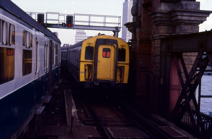 In this view taken from the end of platforms 5 and 6, 4 Vep No. 7864 is observed departing the terminus. On the left is the unmistakeable shape of a ''Hastings'' unit. It was at this point where the signal box was formerly suspended across the tracks, and the large indentation within the bridge support on the right once housed the metal framework of the cabin. © David Glasspool Collection