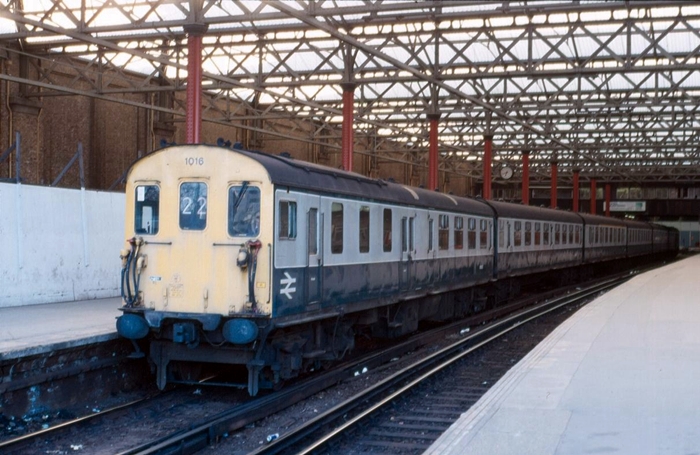 A classic scene at Charing Cross on 3rd May 1986 depicts Hastings ''long'' DEMU No. 1016 stabled within the ''main line'' part of the station, underneath the 1906 ridge-and-furrow roof. Note the light and airy platforms, a feature which today's station lacks. © David Glasspool Colelction