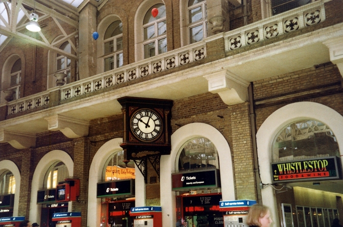Despite the woes of the dark and claustrophobic platforms, the concourse is admittedly very pleasant, and this view from 27th December 2002 shows the spruced up brickwork and antique clock. However, the clock face seen today is not the original. The previous clock face formerly proclaimed ''S. Smith & Son Electrics, 9 Strand'', and had chunkier hands. © David Glasspool