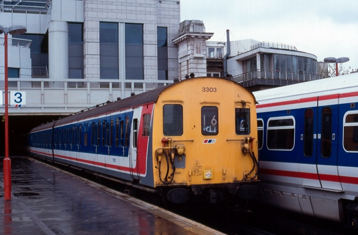 A 1993 view shows the completed station rebuild, an office block now towering over the platforms. Note that this is before the station acquired a footbridge. 4 Cap No. 3303 was seen departing the terminus, forming a service to Sevenoaks. © David Glasspool Collection