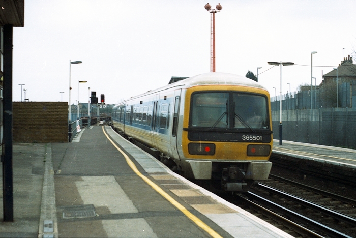 First of the class, No. 365501, was seen on the rear of the train in the previous picture, constituting the rest of an eight car train. The yellow lower half of the carriage bodies is vinyl, but the blue which surrounds the windows is thought to be the existing Network SouthEast livery. © David Glasspool