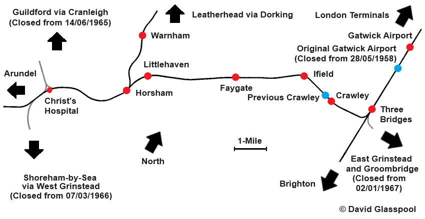This station is a typical 1960s construct: two platforms are dominated by an austere six-storey block, situated 30-miles 49-chains from London Bridge, upon the double-track "Arun Valley Line" linking Three Bridges with the West Coastway Line (Brighton to Havant) at Arundel Junction. A station has existed in Crawley since 1848; however, today’s site was brought into use on 28th July 1968 (ref: RCTS' The Railway Observer, September 1968), replacing the town’s first platforms. It was perhaps a fitting addition to the modern image that was by then known as "Crawley New Town", formally designated as such on 9th January 1947 and planned to be a conurbation 5,920 acres in size (ref: Crawley & District Observer, 17th January 1947). It was one of a series of post-war out-of-city town expansions designed to accommodate that part of the capital’s population displaced by bombing and slum clearance. The population of Crawley as of 31st December 1952 was 14,300 (ref: Local Corporation Files via Sussex Daily News, 12th March 1953); as of 1960, this had jumped to 51,700 (ref: Sunday Mirror, 15th January 1961), and by 1968 stood at 65,000 (ref: Coventry Evening Telegraph, 27th March 1968).